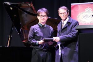 Pictured; Andrew Cochrane presenting the winner of 2025 Celebrating Chopin – Keng Chon (Oscar) Kwan